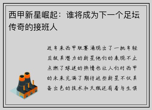 随着西甲新赛季的到来,许多年轻球员展现出强劲的潜力,成为球迷和媒体关注的焦点。这些年轻人不仅代表着西甲未来的希望,也为各大俱乐部注入了新鲜血液。在这篇文章中,我们将对西甲新赛季潜力新星进行全面盘点,探...